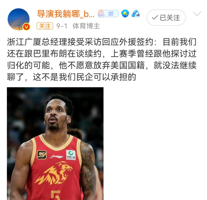 不过就在九月初,就有媒体人爆料,广厦队正在与布朗商讨续约事宜。同时在归化问题上,布朗暂时不愿意答应。