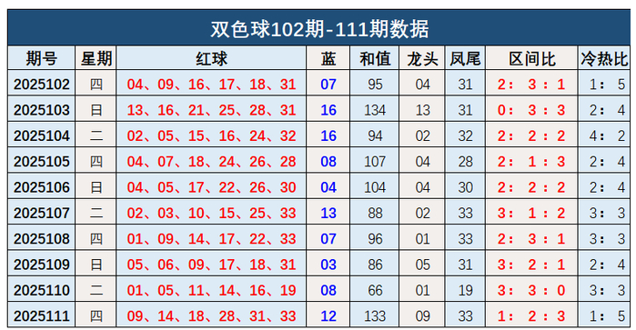 双色球第2025111开奖奖号:红球09、14、18、28、31、33,蓝球12。和值133,龙头09,凤尾33,区间比1:2:3,冷热比1:5。蓝球开出大数号码12。