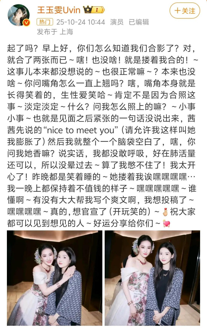 首先就是晚会结束之后,王玉雯发了一条长文,这里面的内容是关于她和刘亦菲合上影了然后激动到“语无伦次”的事情,她的文字里面全是那种追到偶像的开心感,看起来非常可爱非常真实。