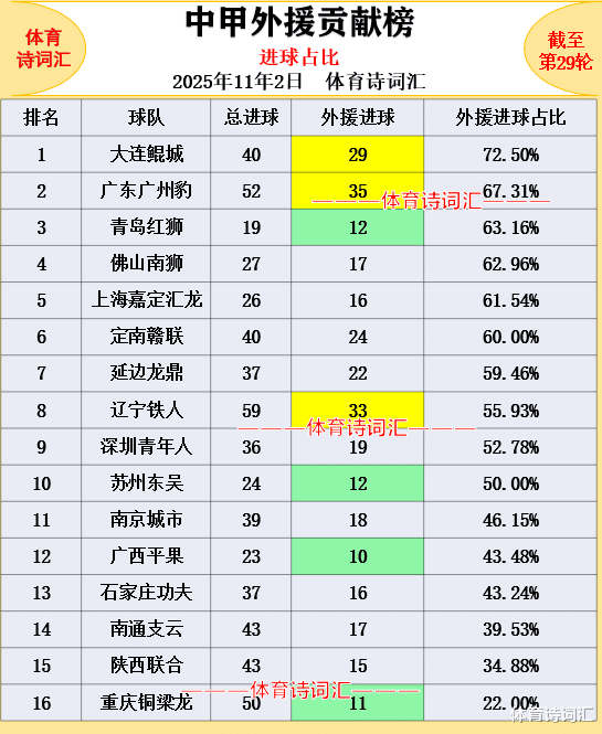 中甲外援进球: 广州豹35球、辽宁33球领跑, 大连72.5%, 重庆仅22%垫底