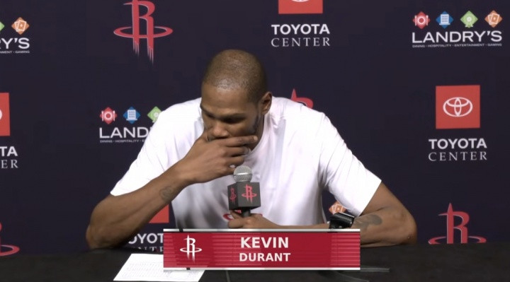 赛后,杜兰特参加新闻发布会,接受了记者的采访。