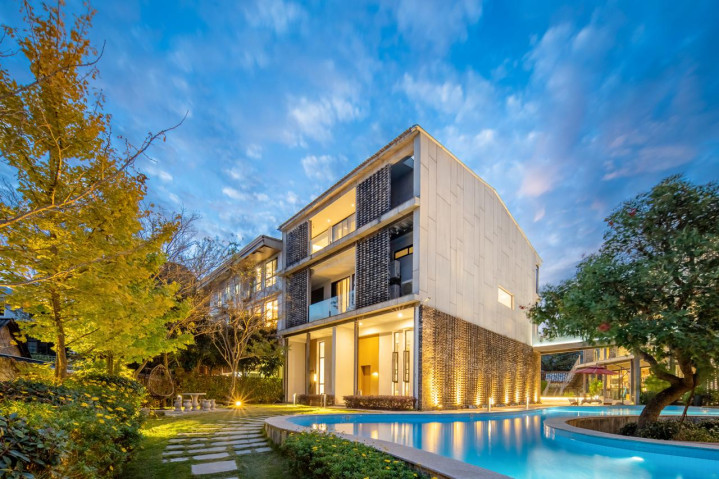 室外草坪上设置的帐篷户外绘画,舒适享受、泳池、餐厅、会议室、游戏室。室内空间宽敞,大房间180多平,最小的房间也有60平,将舒适度细节到了每个角落。
