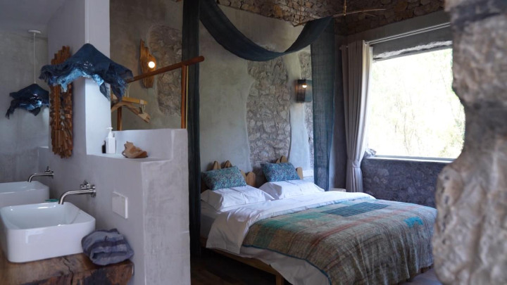 藏身于万福村半山的榕宿客栈,由四栋老屋改造。它忠于布依族传统,采用石木结构,让老屋的岁月感得以保留。这里没有突兀的设计,只有与稻田、峰林、古树的天作之合。室内空间更是一个小型民族艺术展,蜡染、苗绣等元素巧妙融入,文化韵味十足。