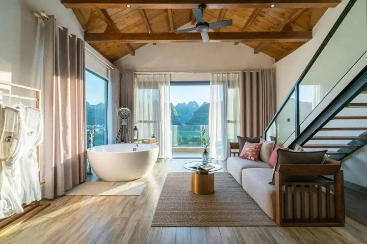 悦栖里共有房间15间,每一间房都有独立阳台,直面万峰林。实现推窗即景,住在景中。房型的选择多样,浴缸大床房、网红滑梯亲子房、超大复式亲子房……除了宽敞的公共空间,这里还有游泳池、恒温温泉泡池、室外烧烤区……让入住的客人充分极致的感受不一样的奢华体验。