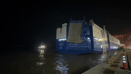 总台“中国红”4K/8K超高清转播车队搭乘的“远海口”轮,是国内最大的光伏能源+LNG液化天然气双燃料汽车船,船身近200米,有12层甲板。此次海运将走地中海班轮航线,航程时效比一般航线压缩了近三分之一,预计12月底前抵达意大利利沃诺港。
