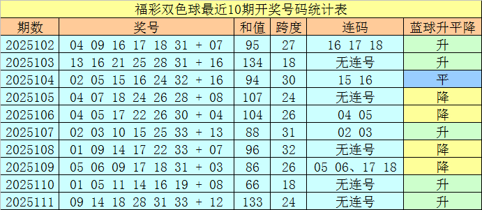 上期开奖:福彩双色球第2025111奖号开出:09 14 18 28 31 33 + 12,红球号码和值为133,首尾间距为24,无连号。