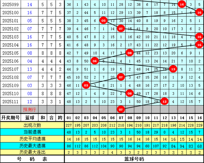 蓝球分析:上期蓝球开出号码12,上升4个点位,最近10期蓝球号码升平降分别为:升、升、平、降、降、升、降、降、升、升,本期看好蓝球下降,独蓝参考07。