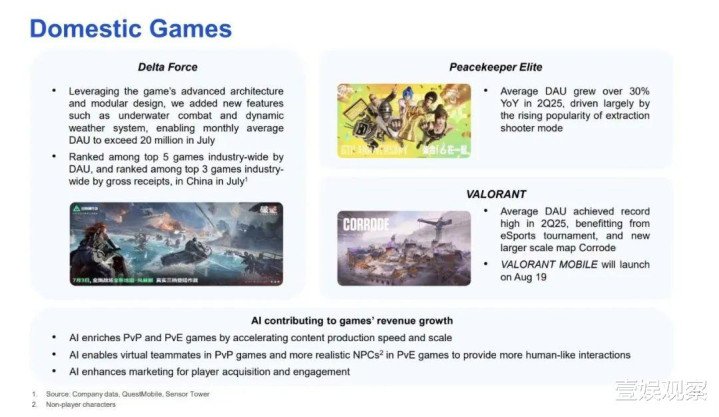 业绩贡献的前两位依旧由《王者荣耀》和《和平精英》占据,但在业绩汇报的另一页PPT上,《三角洲行动》和《无畏契约》两款游戏名字算是第一次被并列放在了一起。