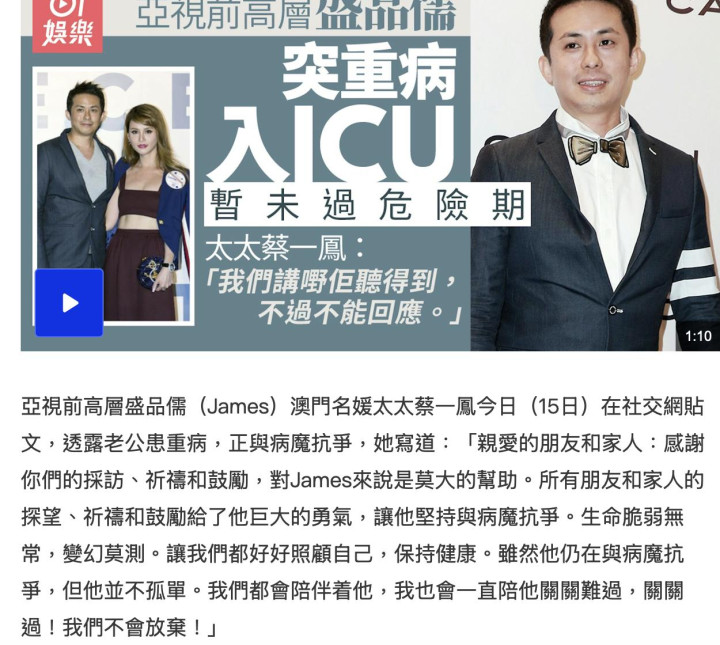 澳门名媛蔡一凤2014年嫁给了名门后代盛品儒,婚后生了一对龙凤胎,一家四口住在香港的超级豪宅中,生活幸福。蔡一凤日理万机,甚少分享生活状况,盛品儒倒是在社交平台上比较活跃,不过近几个月鲜少看到盛品儒在社交平台上活跃,这才得知原来盛品儒患了重病,已经住进了ICU,并且状态不是太理想,仍然在与病魔抗争。蔡一凤在社交平台上公开了这个消息,她需要的是亲人与朋友为丈夫打气,助力丈夫坚持与病魔抗争。