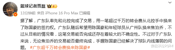 媒体人贾磊发文点评:据了解,广东队率先和北控完成了交易,用一笔超过千万的转会费从北控手中换来了陈国豪的签约权。