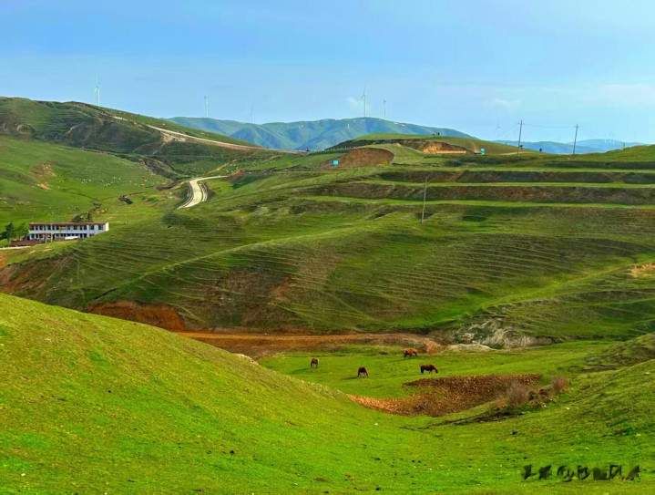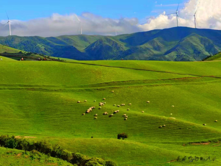 草原上游走的牛羊,与天空浮云、远景的群山、矗立的风力发电机交相辉映,极目远望、蔚为壮观,构成关山古道一道靓丽风景线。风车在云海中旋转,仿佛触手可及,又似遥不可及。云海翻腾,风车旋转,似乎与天空进行着一场无声的交响乐。