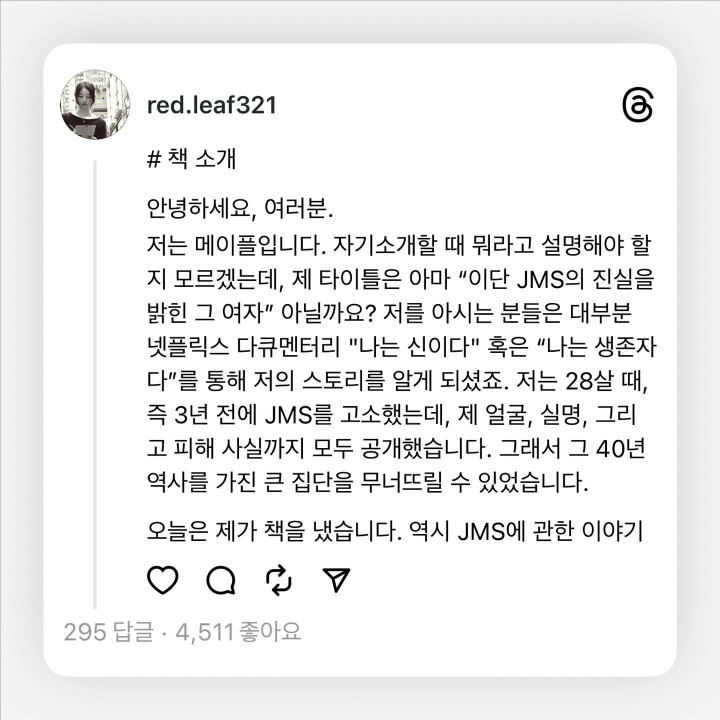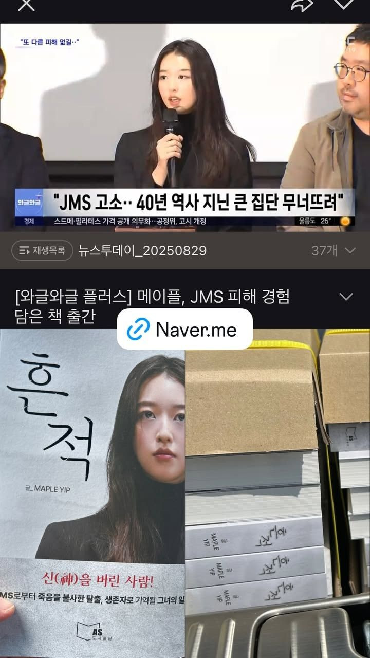 叶萱(Maple)于近期在韩国出版韩文自传《痕迹》,全文记录她自十六岁起被韩国摄理教(JMS)招募、洗脑、脱离并提起诉讼的全过程。她此前在Netflix纪录片《以神之名:信仰的背叛》以及续作《以幸存者之名:深入韩国惨案》中公开指控教主郑明析性侵,并透露相关录音被公开。