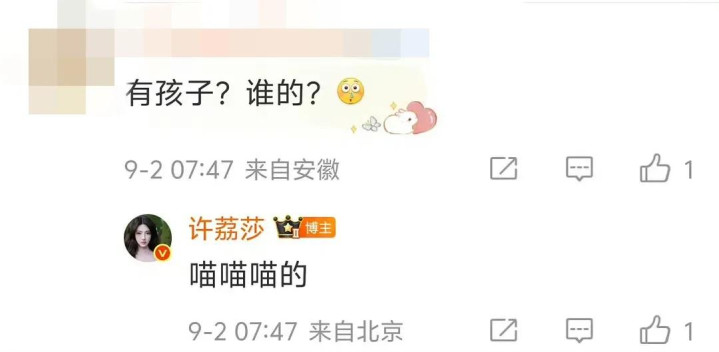 在那之后,就有好事的网友去评论区询问,孩子是谁的,许荔莎回复了个“喵喵喵”的。