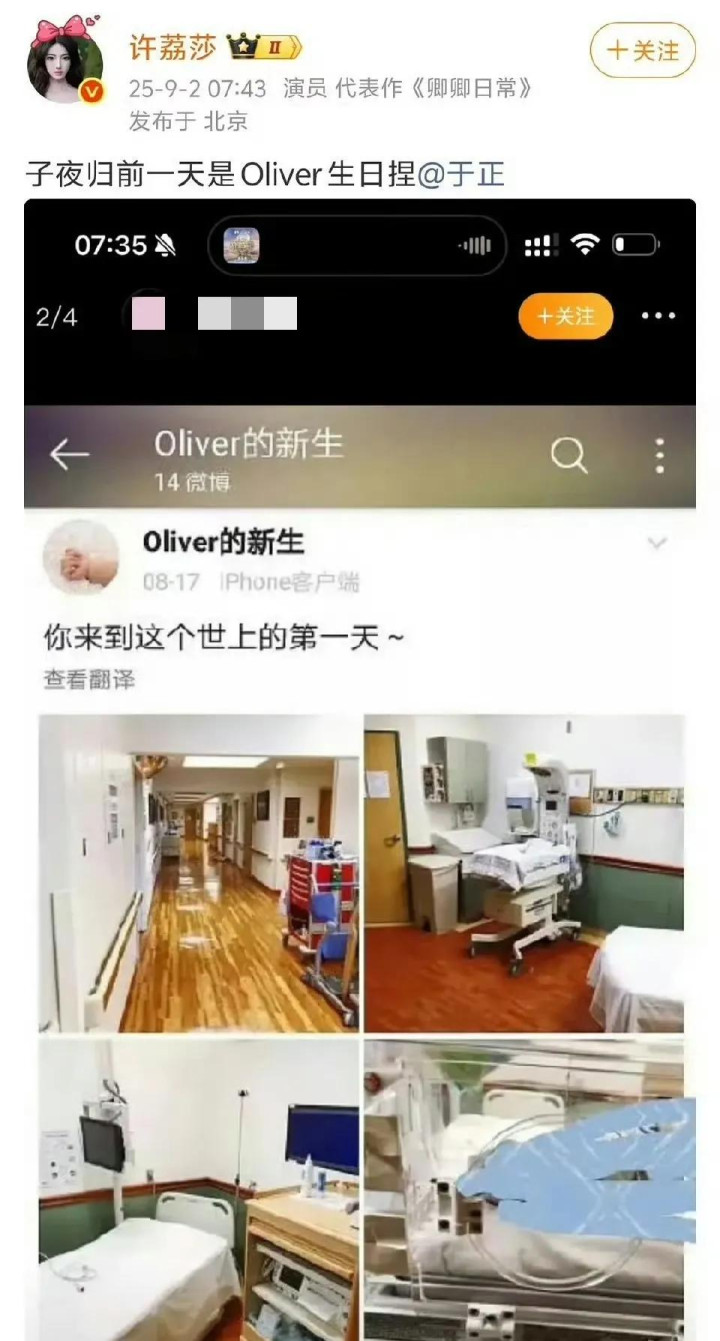许荔莎发文表示:“子夜归前一天是Oliver生日捏”。