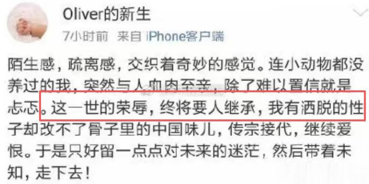 当然,比文字更炸裂的,是她还配了张图,图上写着“Oliver的新生”。