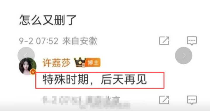 这条信息很快引发网友热议,但是很快,许荔莎又删除了博文,只留下句“特殊时期,后天再见”的暗示。