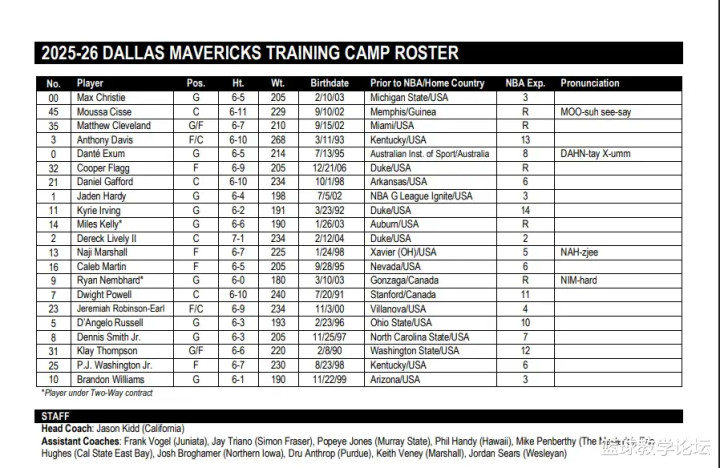 今年休赛期,独行侠3年1.185亿美元续约欧文,第三年球员选项;4年9000万美元续约华盛顿;3年6000万美元续约加福德;2年1160万美元签下拉塞尔。此外,独行侠还用底薪签回埃克萨姆,训练营合同签下小丹尼斯-史密斯。