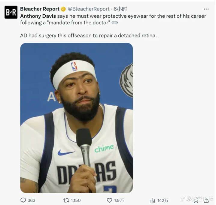 北京时间9月30日,独行侠媒体日,欧文、浓眉和弗拉格正式合体。浓眉的右眼睛有着明显异常,他在接受采访时宣布:“剩余的NBA生涯,我都要戴着护目镜打球。”今年休赛期,浓眉遭遇视网膜脱落,成功接受手术,至今快三个月了。