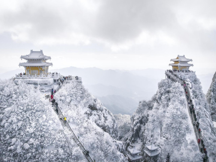 一句老君山下雪了,那么便要看一看这雪中的老君山是什么样的景色。因老君山的海拔较高,每年的12月-2月经常下雪,想去看雪的朋友,元旦假期正合适。雪中的老君山被誉为“天下第一仙山”。